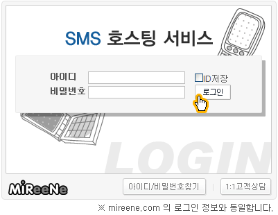 1. SMS °ü¸®ÀÚÆäÀÌÁö(http://sms.mireene.com/)¿¡ Á¢¼ÓÀ» ÇϽðí, ¾ÆÀ̵ð¿Í ÆÐ½º¿öµå¸¦ ÀÔ·ÂÇÕ´Ï´Ù.