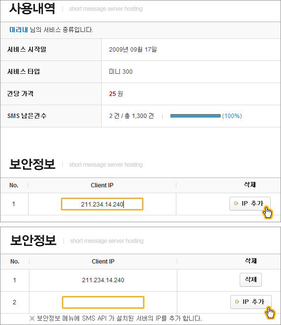 2. º¸¾ÈÁ¤º¸ ¸Þ´º¿¡ SMS API °¡ ¼³Ä¡µÈ ¼­¹öÀÇ IP¸¦ Ãß°¡ ÇÕ´Ï´Ù.